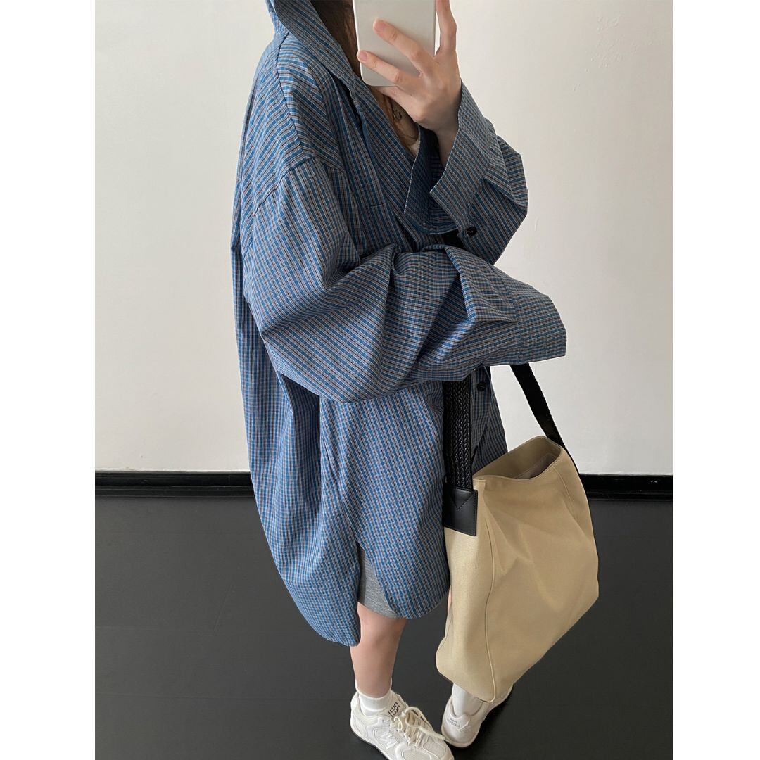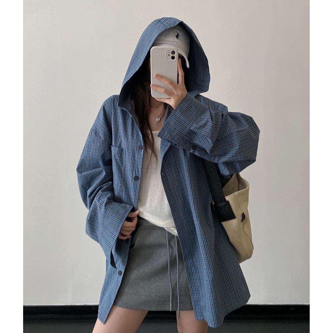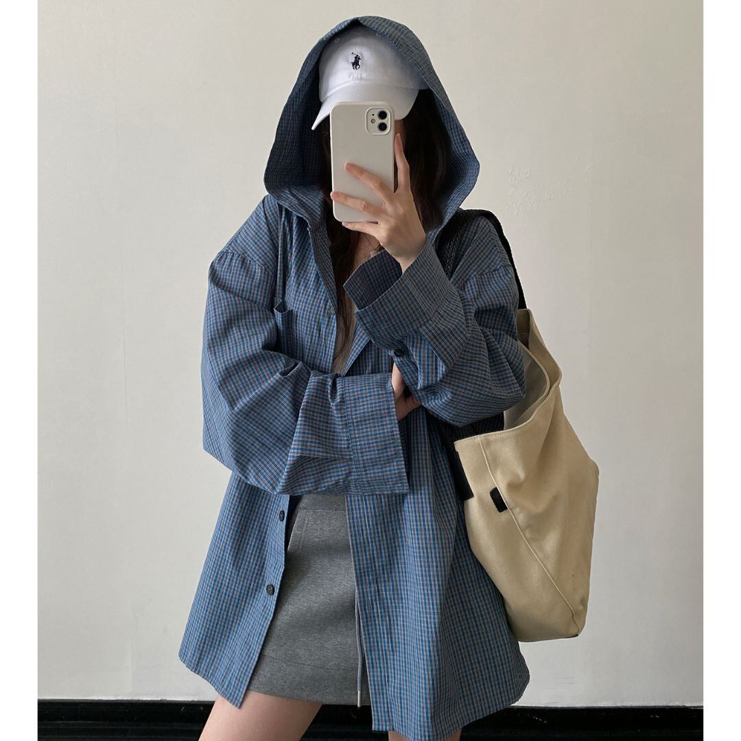 フード付きオーバーサイズボタンダウンチェックシャツ。